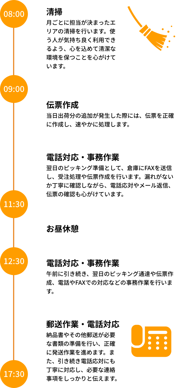 事務というと黙々とデスクワークをするイメージがあるかもしれませんが、サンコウでは問い合わせ窓口としてお客様とコミュニケーションを取りながら、商品の受注につなげる役割も求められます。繁忙期には一日に200件を超えるお電話をいただくこともあり、スタッフ全員で協力しながら対応しています。ご希望の商品が在庫切れの場合には、代替品をご提案させていただくなど、柔軟な対応が必要となる仕事です。