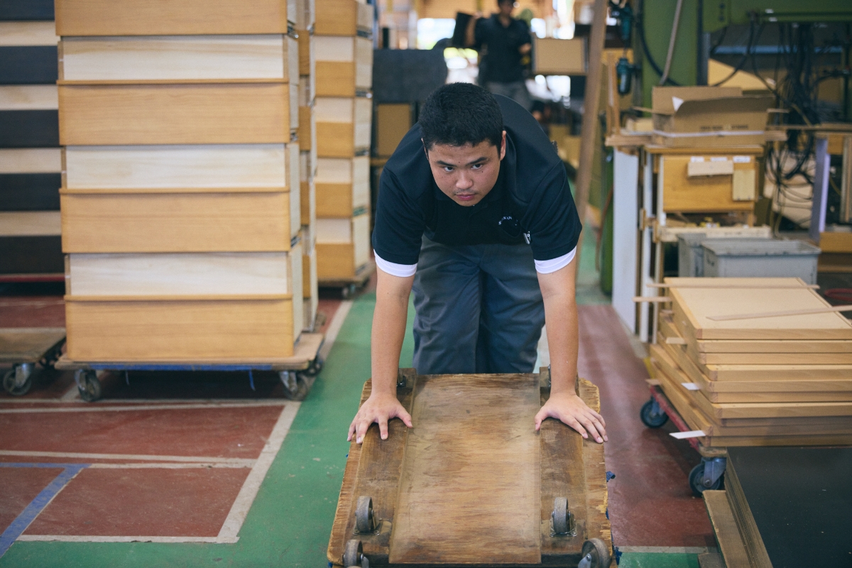 加工・製造部門の一員として、箪笥やTVボードなどに使用される引き出しの組み立て工程を主に担当しています。ほとんどの作業は工具を使った手作業で行われるため、常に集中力が必要です。特に、部品の位置合わせや接合部の精度が仕上がりに大きく影響するため、細部にまで注意を払いながら作業を進めています。丁寧さとスピードの両立が求められるため、そのバランスをどう保つかを意識しながら日々取り組んでいます。