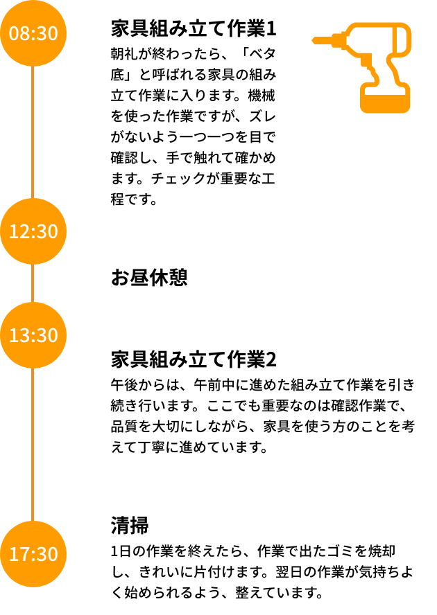 私がサンコウに入社を決めた一番の理由は「人」です。家具づくりは全くの未経験でしたが、2週間の職場体験で働いた際、どの社員も温かく迎えてくれ、ここでなら安心して働けると感じました。入社後も、上司や先輩社員が、経験の浅い私を親身になってサポートしてくれています。私自身も家具職人として成長し、将来新しいメンバーが入ってきた際には、同じようにしっかりとサポートできる存在になりたいです。